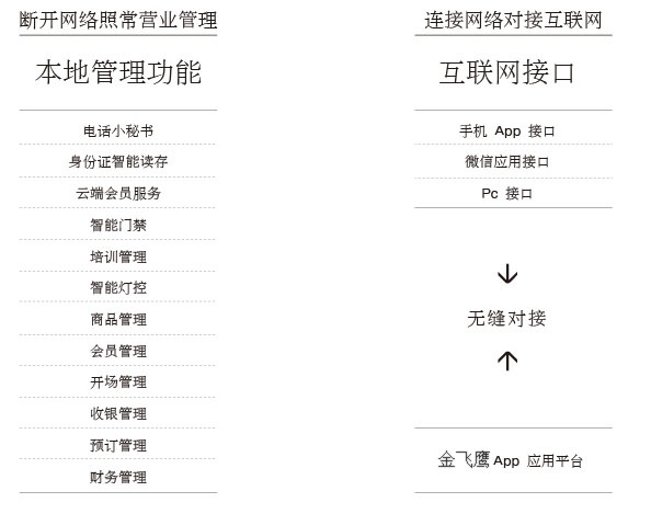 金飞鹰 ERP,创建了互联网接口。更能在网络断开的情况下,场馆正常营业。有效保证场馆的各项经营管理照常进行!